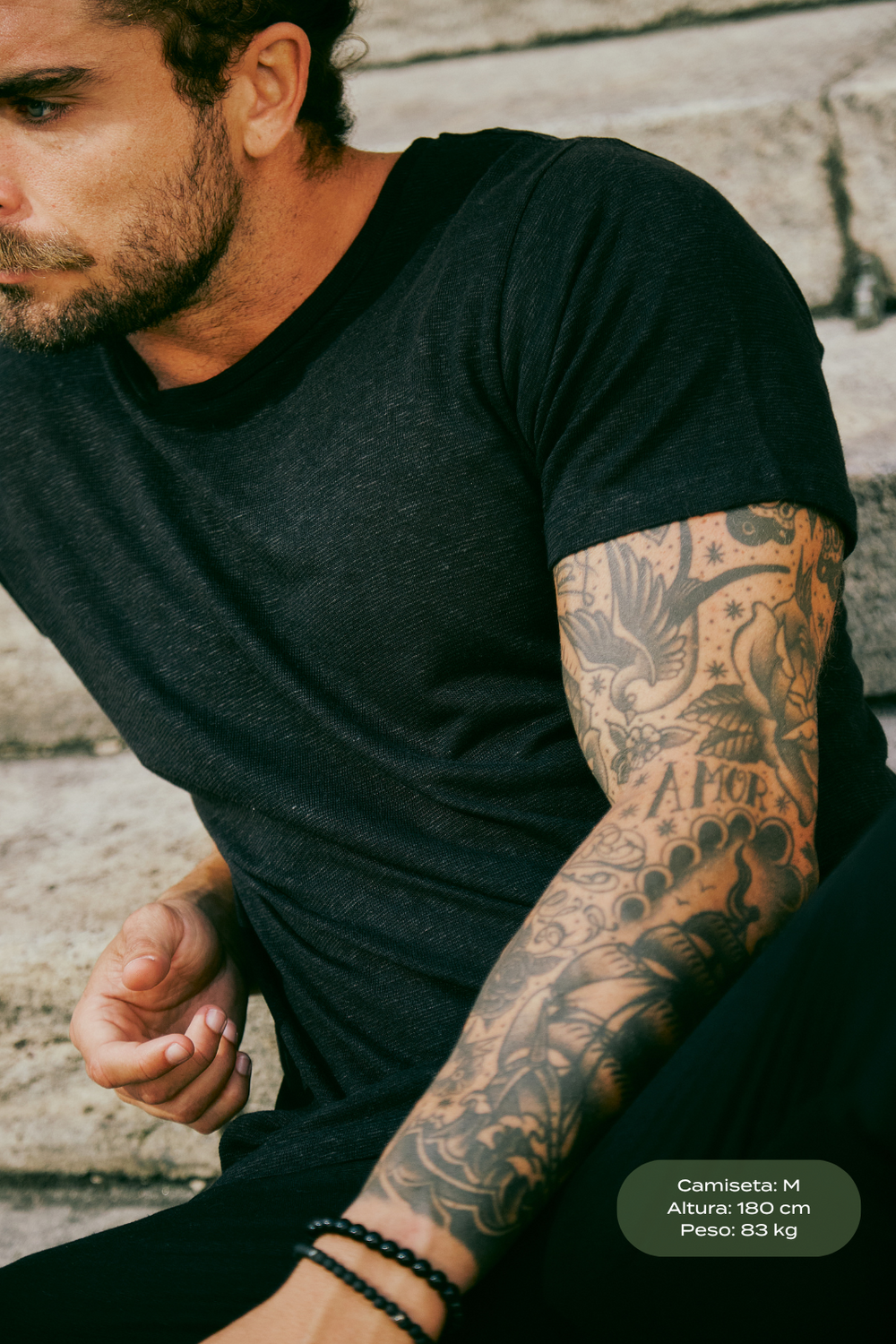O modelo mede 1,80m, pesa 83kg e usa tamanho M.