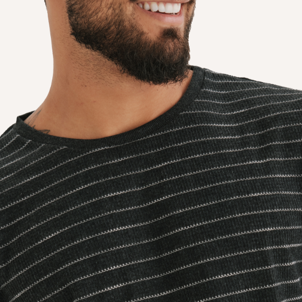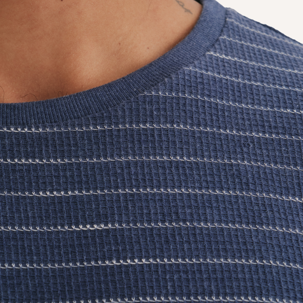 Produzida em malha waffle listrada pré-lavada, ela vem com toque suave e caimento imediato. Composição que combina algodão sustentável e poliéster oferece durabilidade, respirabilidade e conforto diário. A peça está pronta para o uso: sem encolhimento, sem surpresas — apenas qualidade que permanece.