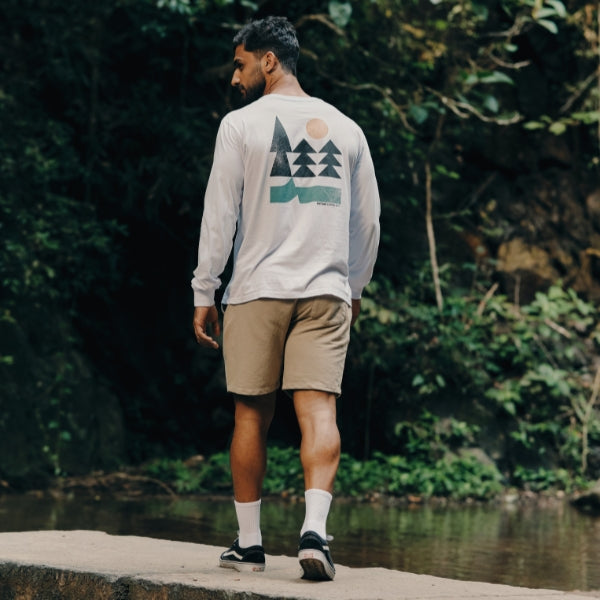 Criada com formas geométricas e textura sutil, a arte carrega um manifesto visual: desacelerar, conectar-se com o natural e valorizar a simplicidade. O sol, as montanhas e as árvores — todos estilizados com equilíbrio e intenção — representam a nossa admiração por paisagens reais que inspiram uma vida mais consciente e leve.