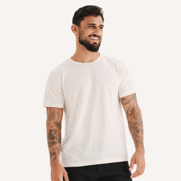 A Camiseta Textile traduz o equilíbrio entre estilo e consciência, feita a partir de uma malha sustentável que combina algodão responsável, poliéster reciclado e linho natural.